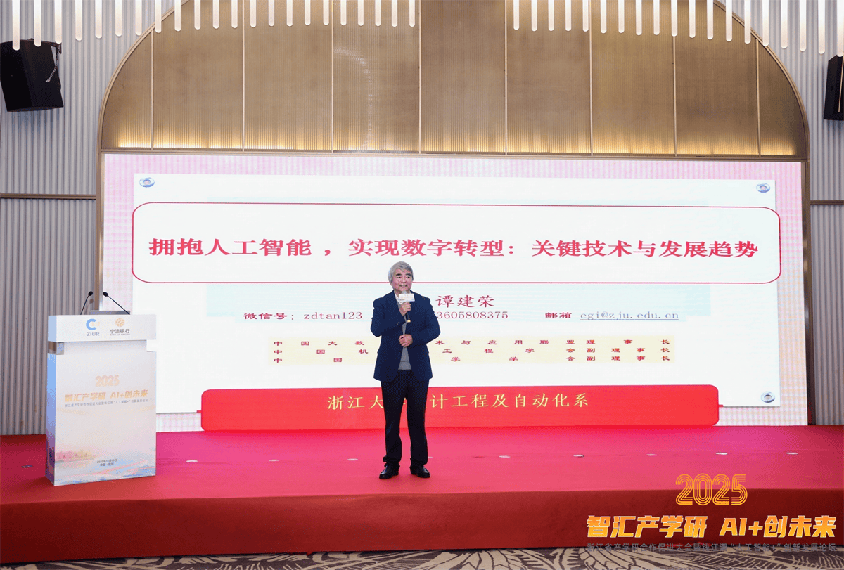中国工程院院士、浙江大学教授谭建荣作《拥抱人工智能,实现数字转型关键技术与发展趋势》主旨报告。他强调,生成式AI与行业大模型正在重塑研发、制造、服务全生命周期,人工智能已从辅助工具演进为新型基础设施,成为数字化转型的核心驱动力,介绍了人工智能三大学派的特点与融合趋势,详解生成式AI的颠覆性价值及模型蒸馏等关键技术。